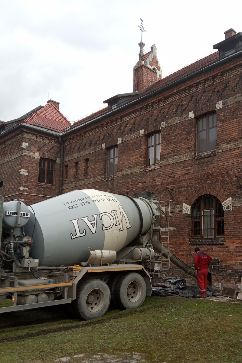 Cieszymy się kolejnym etapem prac w kotłowni, a najbardziej – nową wylewką! To wstęp do posadzki, o której inne pomieszczenia mogą jedynie marzyć. Betoniarka pod klasztorem pojawiła się na chwilę i w błyskawicznym tempie zalała klepisko. To nie te czasy, gdy pracownicy mozolnie wozili beton taczkami!